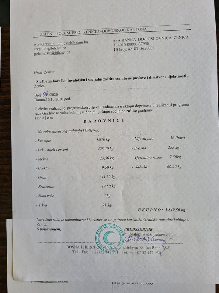 Zeleni polumjesec je za potrebe Gradske narodne kuhinje u ovoj godini donirano 16 tona hrane, dok je za preostale tri općine dodijeljeno ukupno dvije tone hrane. Pored toga, realizovan je projekt podjele tone mlijeka Domu učenika u Medresi, kao i projekt pojedinačne donacije paketa.
