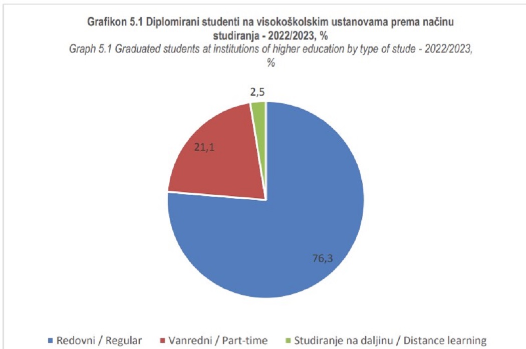 U 2022. godini diplomiralo je 10.374 studenta što je za 10,1 procenat ili za 1.163 studenta manje u odnosu na 2021. godinu. Broj diplomiranih žena je 6.643 ili 64,0 procenta.