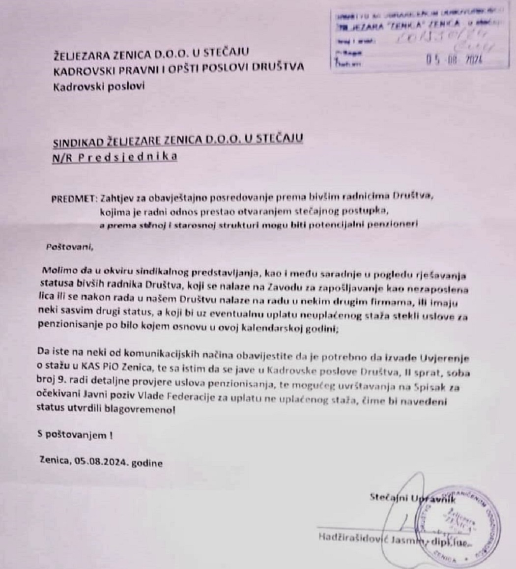 Stečajni upravnik Željezare Zenica, Jasmin Hadžirašidović početkom ove sedmice uputio je Sindikatu zahtjev za posredovanje prema bivšim radnicima Društva, kojima je radni odnos prestao otvaranjem stečajnog postupka, a koji prema stažnoj i starosnoj strukturi mogu biti potencijalni penzioneri.
