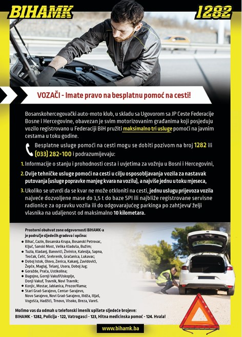 Besplatne usluge pomoći na cesti mogu se dobiti pozivom na broj 1282 ili (033) 282-100, i podrazumijevaju: