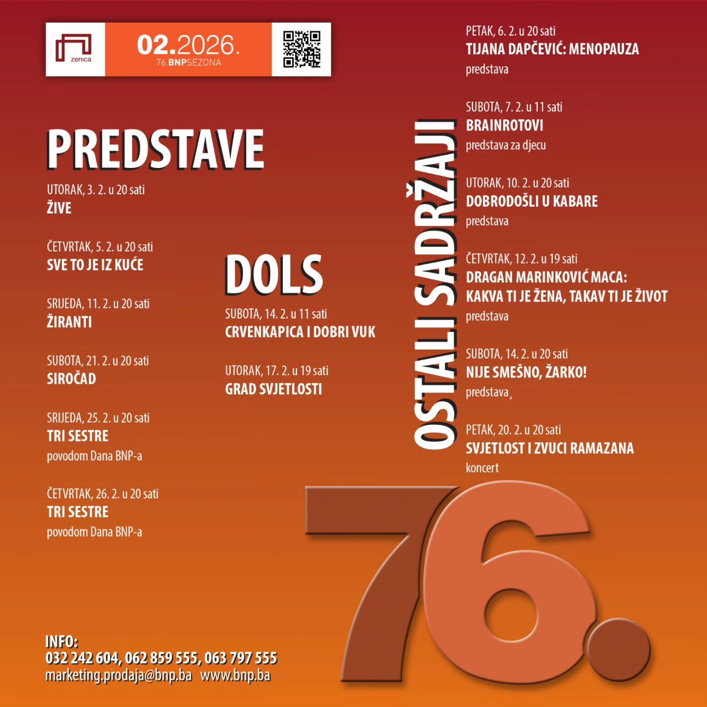 Iz Bosanskog narodnog pozorišta Zenica poručuju da je februarski repertoar tek uvod u dinamičnu i sadržajno bogatu sezonu, uz poziv publici da i dalje svojim dolaskom podržava kulturu i pozorišnu umjetnost.
