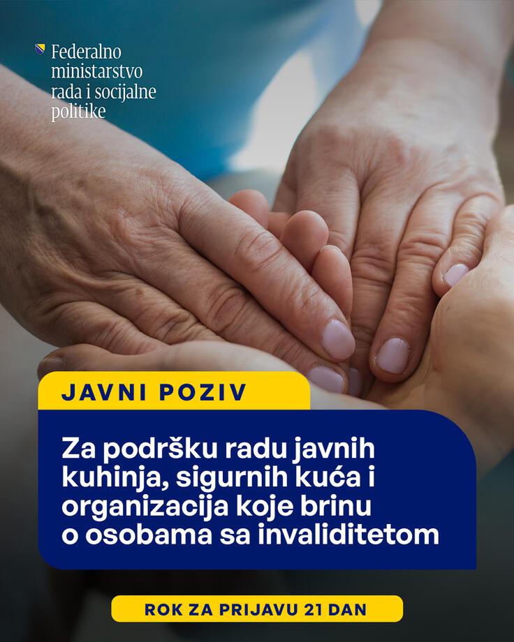 Federalno ministarstvo rada i socijalne politike saopćava da je objavljen javni konkurs za finansiranje projekata udruženja osoba sa invaliditetom, javnih kuhinja i sigurnih kuća u Federaciji BiH za 2026. godinu.